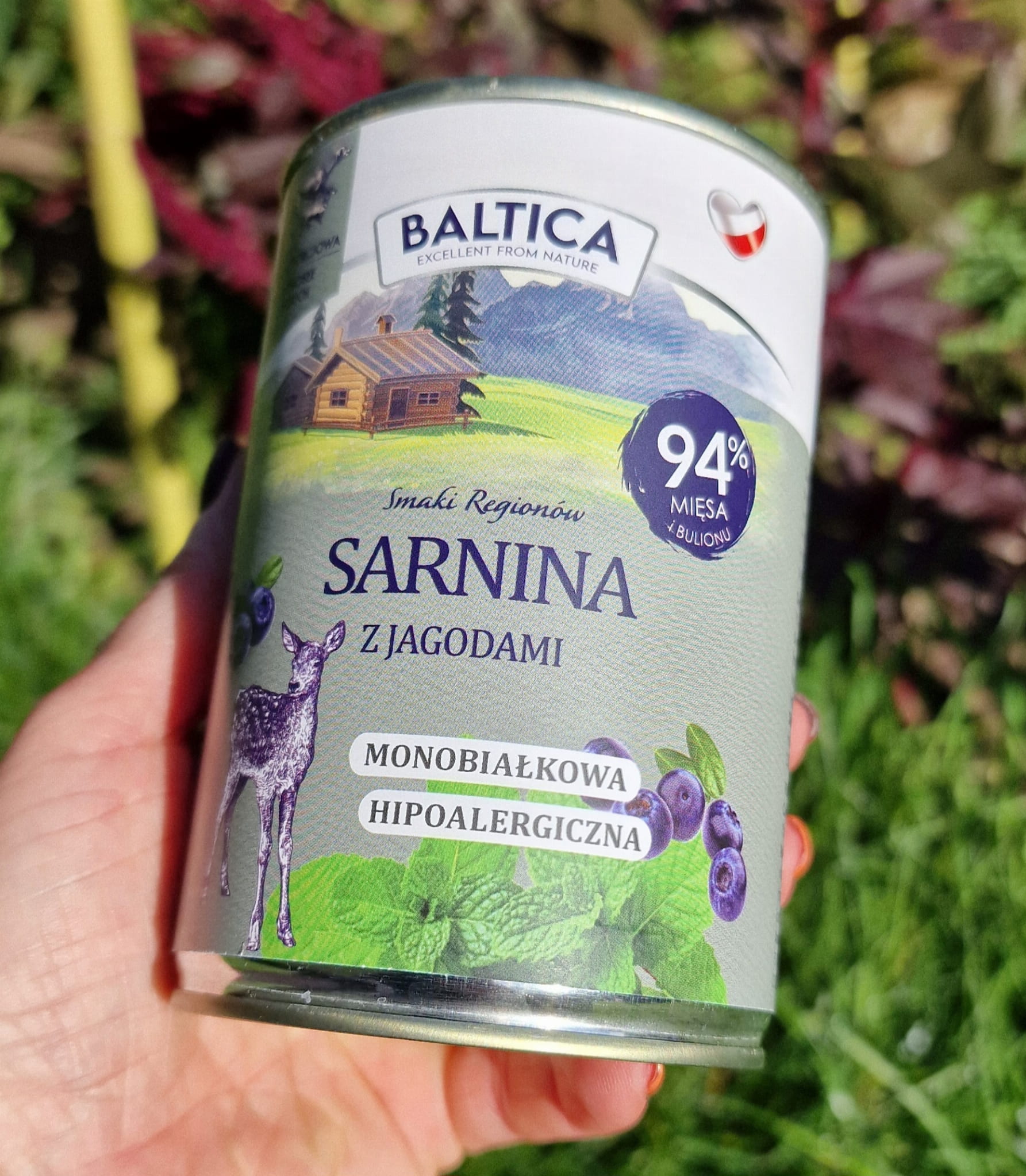 Skład: 94% sarnina (68% mięso z sarny, 26% bulion z sarniny), 4% jagody, 1% minerały, 0,5% jabłko, 0,5% mięta.