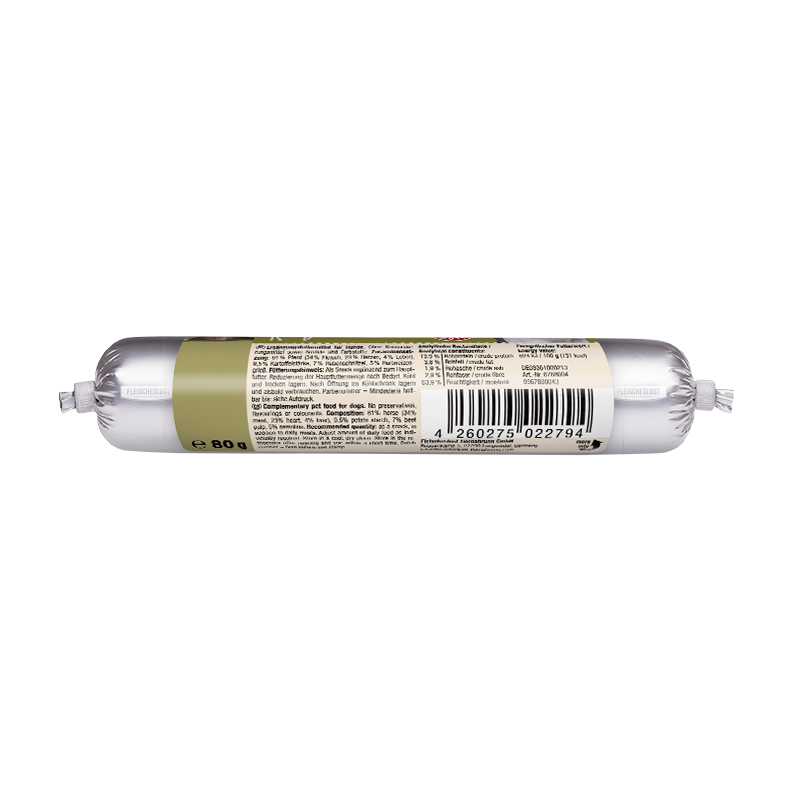 Nowa wersja kiełbasy treningowej z koniny. Odporna na rozpadanie przekąska treningowa z wysokiej jakości naturalnymi składnikami. Zawiera wyłącznie końskie białko zwierzęce. Dzięki temu mokra przekąska jest lekkostrawna i nie zawiera sztucznych aromatów, barwników ani konserwantów.