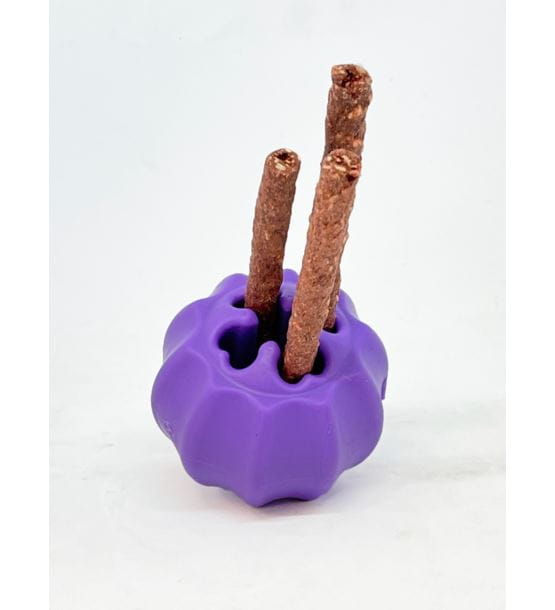 Zabawka wykonana jest z gumy, ale nie byle jakiej gumy. W przeciwieństwie do innych firm, które dodają tanie wypełniacze do swoich mieszanek, aby obniżyć koszty, opatentowana mieszanka gumowa SodaPup jest tworzona bez kompromisów, aby zmaksymalizować wytrzymałość na zniszczenie. Nie wszystkie mieszanki gumowe są takie same! Są one wytwarzane głównie z naturalnego kauczuku, ale zawierają również inne składniki - substancje wiążące i wypełniacze, takie jak glina i krzemionka. Producenci (zwłaszcza dostawcy azjatyccy) obniżają cenę swoich zabawek, dodając do mieszanek gumowych więcej wypełniaczy, a mniej gumy. Chociaż wypełniacze te są niewidoczne dla konsumenta, mają ogromny wpływ na trwałość przedmiotu. SodaPup są bardzo wytrzymałe, nadają się dla psów, które nie oszczędzają zabawek. Zostały zaprojektowane tak, aby wytrzymać gryzienie każdego psa. SodaPup to nie tylko niezwykle sympatyczna zabawka do aportowania i wypełnienia smakołykami - to bardzo mocny gryzak. Twój pies z przyjemnością będzie ją memłał i ściskał, a Ty będziesz spokojny, że nie zrobi sobie krzywdy. Jeśli Twój pies jest niejadkiem, podawaj mu mokre posiłki w tej zabawce, aby spowolnić proces jedzenia i zapewnić mu rozrywkę. Piłka ogranicza niszczenia w domu i pomaga zwalczyć nudę.